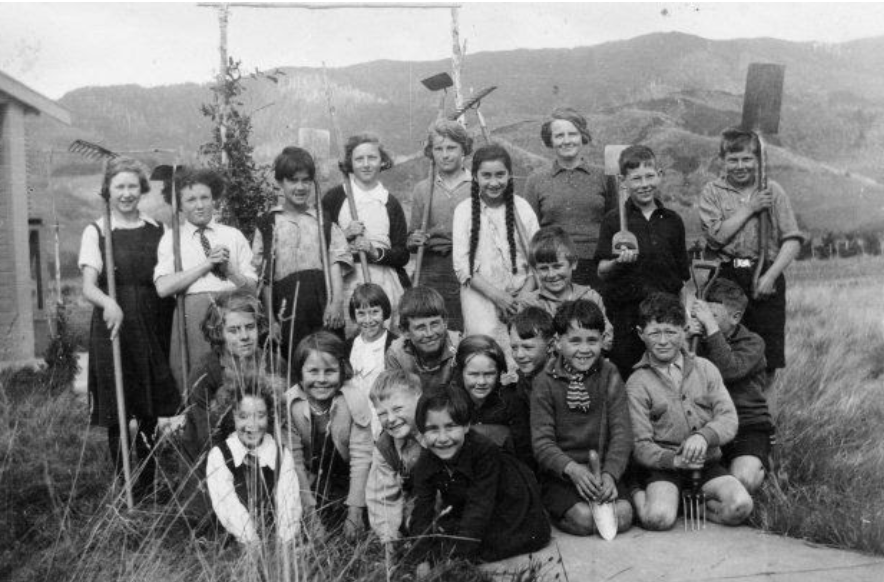 School children with gardening tools, Mangaroa, Upper Hutt, Wellington, 1936Mangaroa School Farm Day